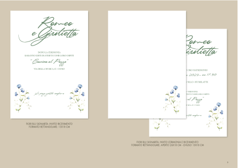 FIORI BLU SIGNARITA: INVITO CERIMONIA E RICEVIMENTO FORMATO RETTANGOLARE: APERTO 26X18 CM - CHIUSO 13X18 CM