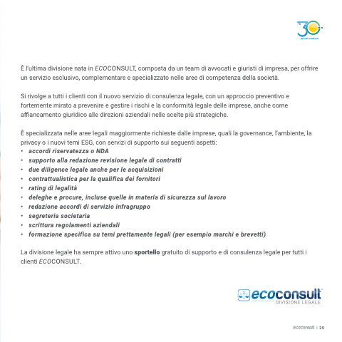 La divisione legale ha sempre attivo uno sportello gratuito di supporto e di consulenza legale per tutti i clienti ECOCONSULT.