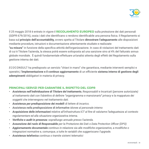 ECOCONSULT ha predisposto un servizio “chiavi in mano” che garantisce, mediante interventi semplici e operativi, l’implementazione e il continuo aggiornamento di un efficiente sistema interno di gestione degli adempimenti obbligatori in materia di privacy.