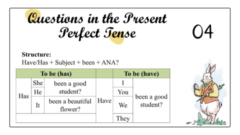 Questions in the Present Perfect Tense 04 Structure: Have/Has + Subject + been + ANA? To be (has) To be (have) She been a good I He student? You Has been a good been a beautiful Have It We student? flower? They