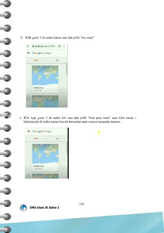b. Klik garis 3 di sudut kanan atas dan pilih “my map” c. Klik lagi garis 3 di sudut kiri atas dan pilih “buat peta baru” atau klim tanda + bulat merah di sudut kanan bawah Kemudian akan muncul tampailan berikut : 119 SMA Islam Al Azhar 2