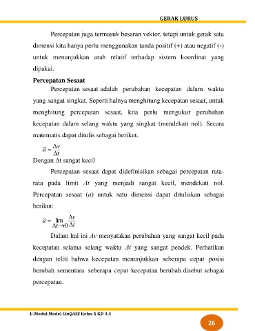 Percepatan sesaat (a) untuk satu dimensi dapat dituliskan sebagai