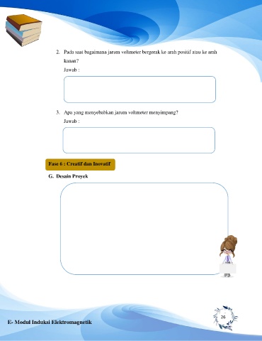 2. Pada saat bagaimana jarum voltmeter bergerak ke arah positif atau ke arah kanan? Jawab : 3. Apa yang menyebabkan jarum voltmeter menyimpang? Jawab : Fase 6 : Creatif dan Inovatif G. Desain Proyek 26 E- Modul Induksi Elektromagnetik