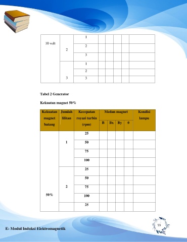 1 10 volt 2 2 3 1 2 3 3 Tabel 2 Generator Kekuatan magnet 50% Kekuatan Jumlah Kecepatan Medan magnet Kondisi magnet lilitan royasi turbin lampu batang (rpm) B Bx By θ 25 1 50 75 100 25 50 2 75 50% 100 25 55 E- Modul Induksi Elektromagnetik
