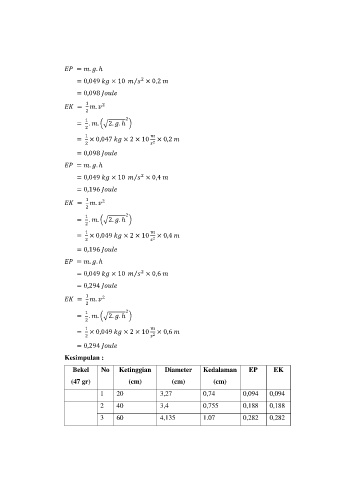 ⁄ (√ ) ⁄ (√ ) ⁄ (√ ) Kesimpulan : Bekel No Ketinggian Diameter Kedalaman EP EK (47 gr) (cm) (cm) (cm) 1 20 3,27 0,74 0,094 0,094 2 40 3,4 0,755 0,188 0,188 3 60 4,135 1.07 0,282 0,282
