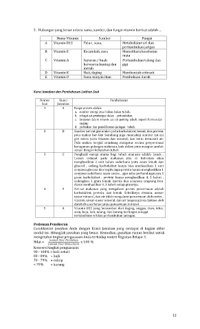 5. Hubungan yang benar antara nama, sumber, dan fungsi vitamin berikut adalah….