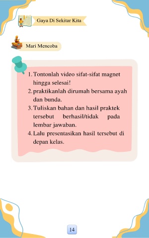 1. Tontonlah video sifat-sifat magnet hingga selesai! 2. praktikanlah dirumah bersama ayah dan bunda. 3. Tuliskan bahan dan hasil praktek tersebut berhasil/tidak pada lembar jawaban. 4. Lalu presentasikan hasil tersebut di depan kelas. 14