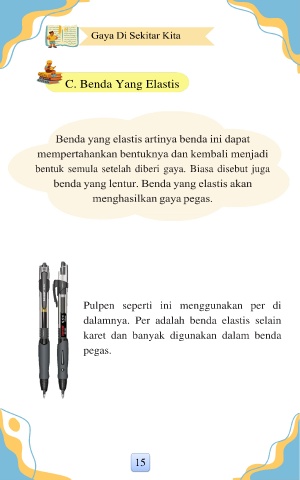 C. Benda Yang Elastis bentuk semula setelah diberi gaya. Biasa disebut juga Pulpen seperti ini menggunakan per di dalamnya. Per adalah benda elastis selain karet dan banyak digunakan dalam benda pegas. 15