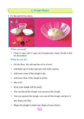 • Flour (1 cup), salt (1 cup), oil (4 teaspoons), water. Seeds or dal