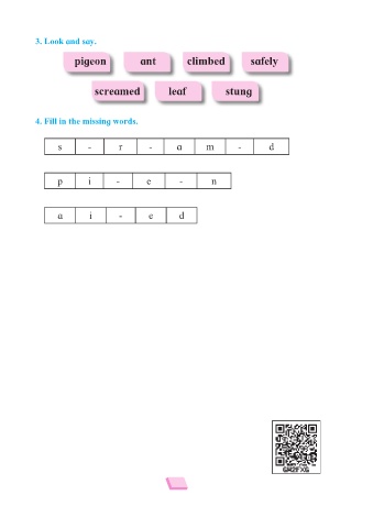3. Look and say. pigeon ant climbed safely screamed leaf stung 4. Fill in the missing words. s - r - a m - d p i - e - n a i - e d 62