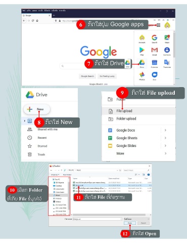 ົ 6 ກດໃສປມ Google apps ກດໃສ Drive 7 ົ ົ 9 ກດໃສ File upload ົ ກດໃສ New 8 ື ເລອກ Folder 10 ່ ີ ົ 11 ໍ ີ ທເກບ File ຂມນໄວ ກດໃສ File ທຕອງການ ັ ່ ົ ກດໃສ Open 12