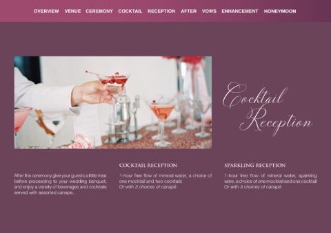 before proceeding to your wedding banquet, one mocktail and two cocktails wine, a choice of one mocktail and one cocktail
