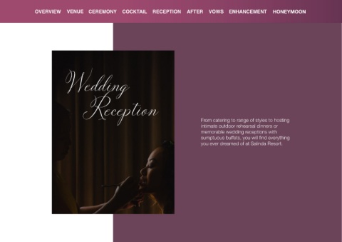 Wedding Reception From catering to range of styles to hosting intimate outdoor rehearsal dinners or memorable wedding receptions with sumptuous buffets, you will find everything you ever dreamed of at Salinda Resort.