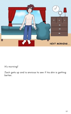 It's morning! Zach gets up and is anxious to see if his skin is getting better. 12