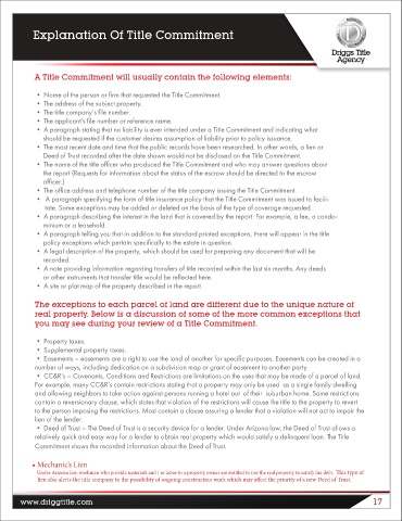 • A paragraph specifying the form of title insurance policy that the Title Commitment was issued to facili-
