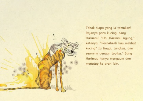 Tebak siapa yang ia temukan! Rajanya para kucing, sang Harimau! "Oh, Harimau Agung," katanya, "Pernahkah kau melihat kucing? Ia tinggi, tangkas, dan sewarna dengan topiku." Sang Harimau hanya mengaum dan menatap ke arah lain.