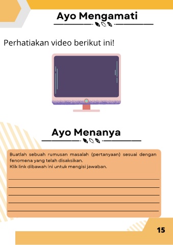 Ayo Mengamati Perhatiakan video berikut ini! 2 Ayo Menanya Buatlah sebuah rumusan masalah (pertanyaan) sesuai dengan fenomena yang telah disaksikan. Klik link dibawah ini untuk mengisi jawaban. 4 2 15