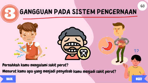 60 GANGGUAN PADA SISTEM PENCERNAAN Pernahkah kamu mengalami sakit perut? Menurut kamu apa yang menjadi penyebab kamu menjadi sakit perut? BACK NEXT