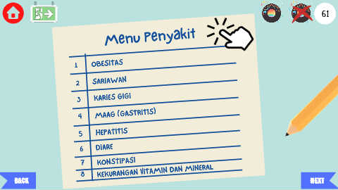 61 Menu Penyakit 1 OBESITAS SARIAWAN 2 KARIES GIGI 3 MAAG (GASTRITIS) 4 HEPATITIS 5 6 DIARE 7 KONSTIPASI 8 KEKURANGAN VITAMIN DAN MINERAL BACK NEXT
