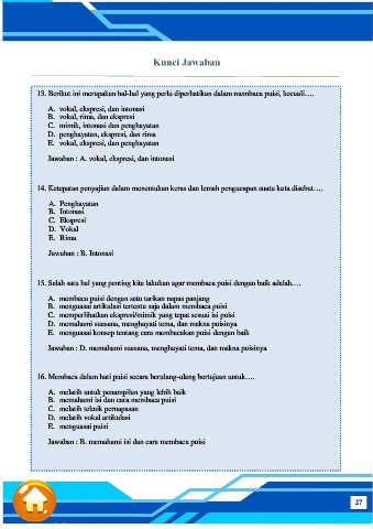 13. Berikut ini merupakan hal-hal yang perlu diperhatikan dalam membaca puisi, kecuali….