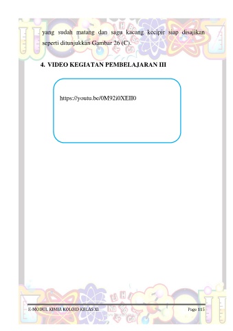 yang sudah matang dan sagu kacang kecipir siap disajikan seperti ditunjukkan Gambar 26 (C). 4. VIDEO KEGIATAN PEMBELAJARAN III https://youtu.be/0M92i0XEII0 E-MODUL KIMIA KOLOID KELAS XI Page 115