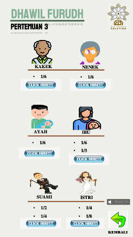 DHAWIL FURUDH PERTEMUAN 3 KAKEK NENEK • 1/6 • 1/6 AYAH IBU • 1/6 • 1/6 • 1/3 SUAMI ISTRI • 1/2 • 1/4 • 1/4 • 1/8