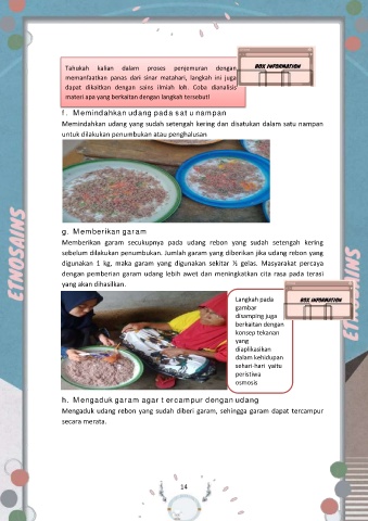 Mengaduk udang rebon yang sudah diberi garam, sehingga garam dapat tercampur