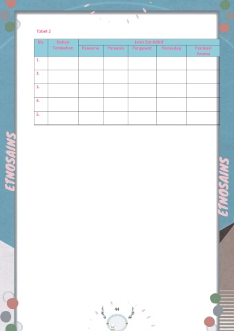 Tabel 2 No. Bahan Jenis Zat Aditif Tambahan Pewarna Pemanis Pengawet Penyedap Pemberi Aroma 1. 2. 3. 4. 5. 44