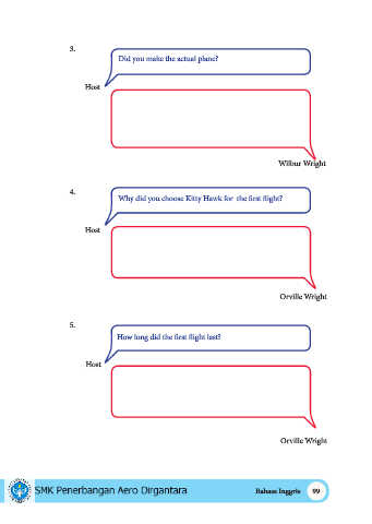 3. Did you make the actual plane? Host Wilbur Wright 4. Why did you choose Kitty Hawk for the first flight? Host Orville Wright 5. How long did the first flight last? Host Orville Wright Bahasa Inggris 99