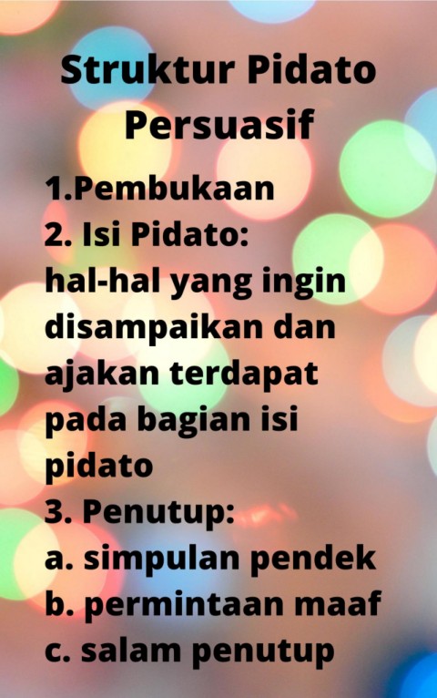 Struktur Pidato Persuasif 1.Pembukaan 2. Isi Pidato: hal-hal yang ingin disampaikan dan ajakan terdapat pada bagian isi pidato 3. Penutup: a. simpulan pendek b. permintaan maaf c. salam penutup