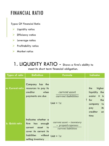 1. LIQUIDITY RATIO - Shows a firm’s ability to