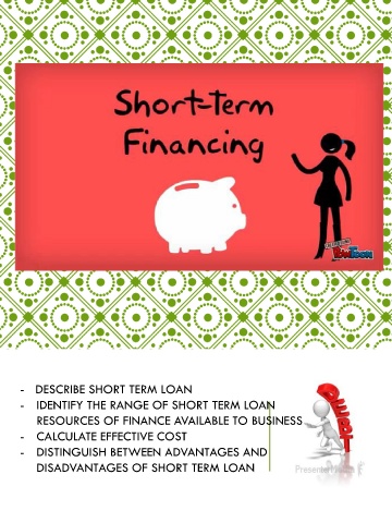 - DESCRIBE SHORT TERM LOAN - IDENTIFY THE RANGE OF SHORT TERM LOAN RESOURCES OF FINANCE AVAILABLE TO BUSINESS - CALCULATE EFFECTIVE COST - DISTINGUISH BETWEEN ADVANTAGES AND DISADVANTAGES OF SHORT TERM LOAN