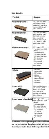 Liste de prix : Produit Couleur fChromatic Tecno 2214 gris, 2215 arena, 216 cemento, 2241 moka, 2213 miel, 2212 marron, 2204 weng%u00e9, 2211 antracita 2!Chromatic Natur 2214 gris, 2215 arena, 2216 cemento, 2217 blanco, 2241 moka, 2213 miel, 2212 marron, 2204 weng%u00e9, 2211 antracita, 2487 Moss, 2488 Cobalt 2!Nature wood-effect 2321 nogal, 2332 silver, 2326 teka, 2333 castano, 2350 greenwood, 2349 roble, 2348 ipe, 2347 polar, 2364 luna, 2365 cinnamon, 2361 sandalo, 2377 cosumel, 2482 havanna, 2481 nielsen 2Ethnic 2395 iroko 2396 bamboo 2397 antique 2398 lino 2490 Indigo 2489 Formentera 2301 Preto 2508 Aloha 2Natur Solid 2214 gris, 2215 arena, 216 cemento, 2217 blanco, 2241 moka, 2213 miel, 2212 marron, 2204 weng%u00e9, 2211 antracita 2Natur wood-effect Solid2321 nogal, 2332 silver, 2326 teka, 2333 castano, 2350 greenwood, 2349 roble, 2348 ipe, 2347 polar, 2364 luna, 2365 cinnamon, 2361 sandalo, 2337 cosumel, 2482 havanna, 2481 nielsen 2!! Les frais de transport depuis l%u2019usine %u00e0 notre par cas en fonction du volume, mais pr%u00e9voir mchantier, un autre devis de transport devra %u00eat