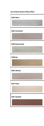 Les surfaces Nature Wood effect2332 Silver 2365 Cinnamon 2350 Greenwood 2348 Ipe 2481 Nielsen 2347 Polar 2361 Sandalo