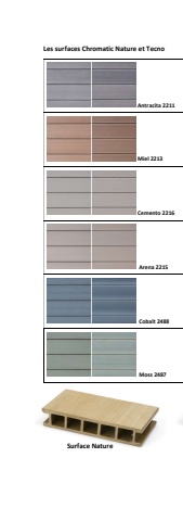 Les surfaces Chromatic Nature et Tecno Antracita 2211 Miel 2213 Cemento 2216 Arena 2215 Cobalt 2488 Moss 2487 Surface Nature