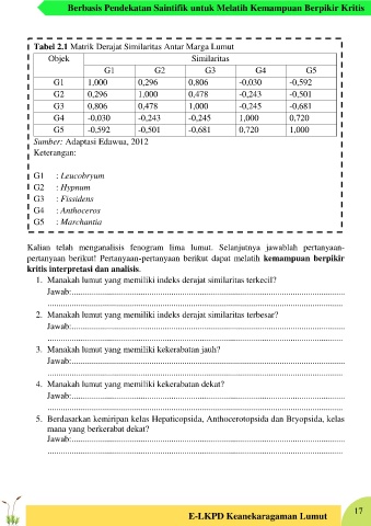 1. Manakah lumut yang memiliki indeks derajat similaritas terkecil?
