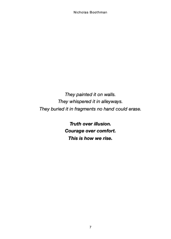 Nicholas Boothman They painted it on walls. They whispered it in alleyways. They buried it in fragments no hand could erase. Truth over illusion. Courage over comfort. This is how we rise. 7