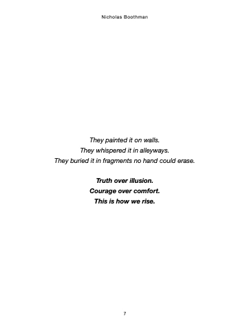 Nicholas Boothman They painted it on walls. They whispered it in alleyways. They buried it in fragments no hand could erase. Truth over illusion. Courage over comfort. This is how we rise. 7