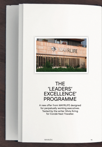 THE ‘LEADERS’ EXCELLENCE’ PROGRAMME A new offer from MAYRLIFE designed for perpetually working executives. Tested by the writer Silvia Ihring for Condé Nast Traveller. 64