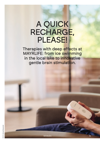 PHOTO: Michael Königshofer A QUICK RECHARGE, PLEASE! Therapies with deep effects at MAYRLIFE: from ice swimming in the local lake to innovative gentle brain stimulation. 78