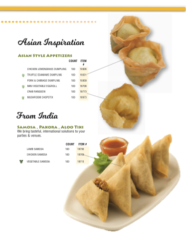 CHICKEN LEMONGRASS DUMPLING 100 a TRUFFLE EDAMAME DUMPLING 100 PORK & CABBAGE DUMPLING 100 a MINI VEGETABLE EGGROLL 100 CRAB RANGOON 100 a MUSHROOM CHOPSTIX 100