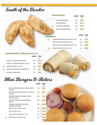 MINI PULLED PORK SLIDERS 100 BEEF SLIDERS (2 OZ) 40 PULLED PORK SLIDERS (2.7 OZ) 40 PORTOBELLO SLIDERS (2 OZ) 40