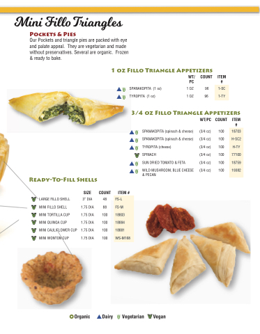 Our Pockets and triangle pies are packed with eye and palate appeal. They are vegetarian and made without preservatives. Several are organic. Frozen & ready to bake.