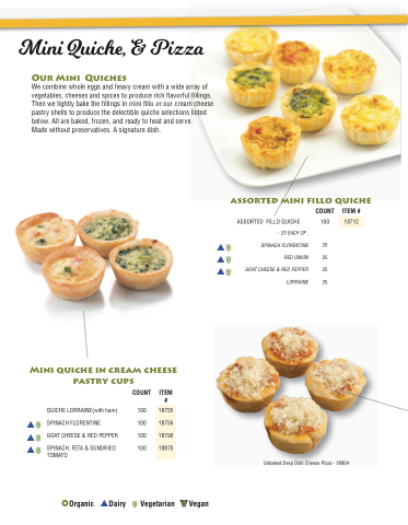 We combine whole eggs and heavy cream with a wide array of vegetables, cheeses and spices to produce rich flavorful fillings. Then we lightly bake the fillings in mini fillo or our cream cheese pastry shells to produce the delectible quiche selections listed below. All are baked, frozen, and ready to heat and serve.