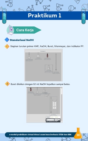 Praktikum 1 Cara Kerja Standarisasi NaOH 1 Siapkan Larutan primer KHP, NaOH, Buret, Erlenmeyer, dan indikator PP. 2 Buret diisikan dengan 52 mL NaOH tepatkan sampai batas. e-modul praktikum virtual titrasi asam basa berbasis STEM dan KBK 30