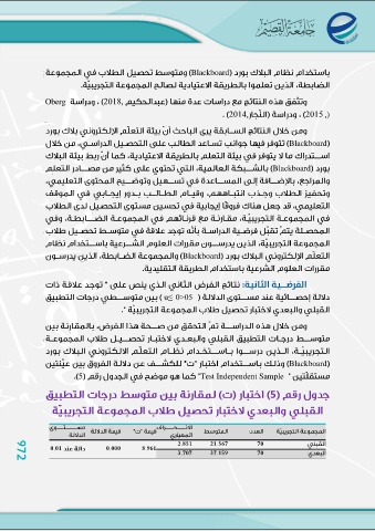 Blackboard Oberg 2018, 2014, 2015 ,) Blackboard Blackboard Blackboard :الفرضااياة الثاااياة u≤ 0>05 Blackboard 5 Test Independent Sample 5 972 0.01 0.000 8.961 2.851 21.567 70 3.707 37.159 70 972