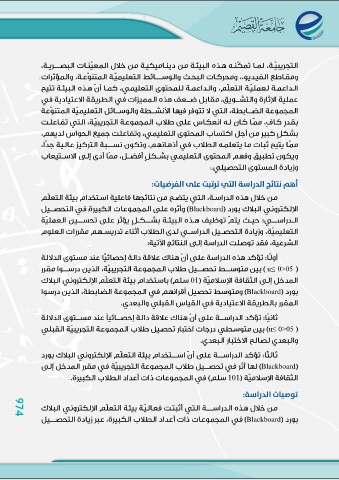 974 أهم اتائج الدراسة التي يريبت عأ الفرضيات: Blackboard u≤ 0>05 01 Blackboard u≤ 0>05 Blackboard 101 يوصيات الدراسة: Blackboard 974