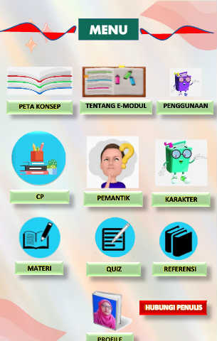 MENU PETA KONSEP TENTANG E-MODUL PENGGUNAAN CP PEMANTIK KARAKTER MATERI QUIZ REFERENSI HUBUNGI PENULIS PROFILE