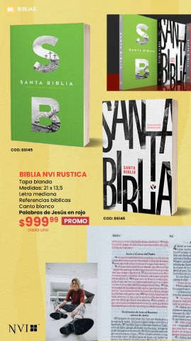 COD: BS145 BIBLIA NVI RUSTICA Tapa blanda Medidas: 21 x 13,5 Letra mediana Referencias biblicas Canto blanco Palabras de Jesús en rojo COD: BS146