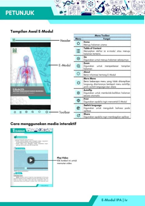 PETUNJUK APLIKASI Tampilan Awal E-Modul Cara menggunakan media interaktif E-Modul IPA | iv